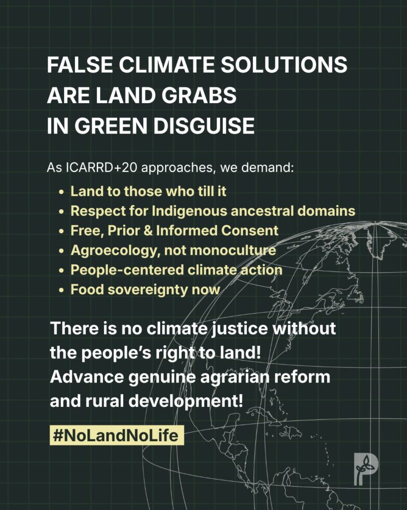 As we head toward the Second International Conference on Agrarian Reform and Rural Development (ICARRD+20) on 24-28 February in Cartagena, Colombia, farmers and Indigenous Peoples across Asia are being pushed off their lands in the name of “climate action.” From carbon offsets and mega-dams to plantations and so-called green infrastructure, false climate solutions have become new tools for land grabbing – destroying livelihoods, violating ancestral domains, and undermining food sovereignty.