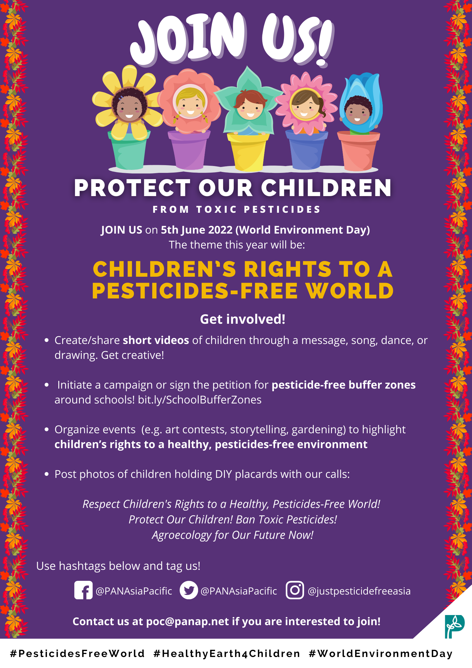 JOIN US on 5th June 2022 (World Environment Day) with the theme “Children’s Rights to a Pesticides-Free World”!